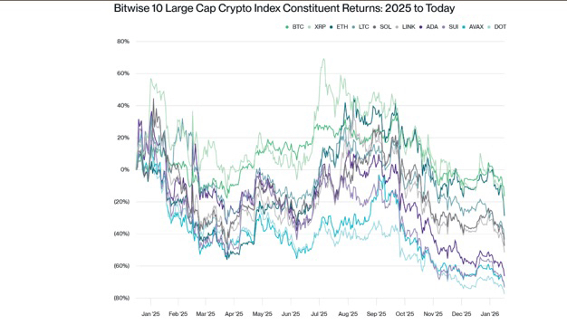 Индекс Bitwise 10 Large Cap показал, что производительность лучших криптовалют по трем категориям была в значительной степени неоднородной. Цены на биткойн, эфириум и XRP, известные как активы группы 1, снизились на 10.3% до 19.9%, в то время как активы группы 2 — Солана (SOL), Лайткойн (LTC) и Чейнлинк (LINK) — снизились на 36.9% до 46.2%. С другой стороны, активы группы 3 — Кардано (ADA), Аваланч (AVAX), Суй (SUI) и Полкадот (DOT) снизились на 61.9% до 74.7%.