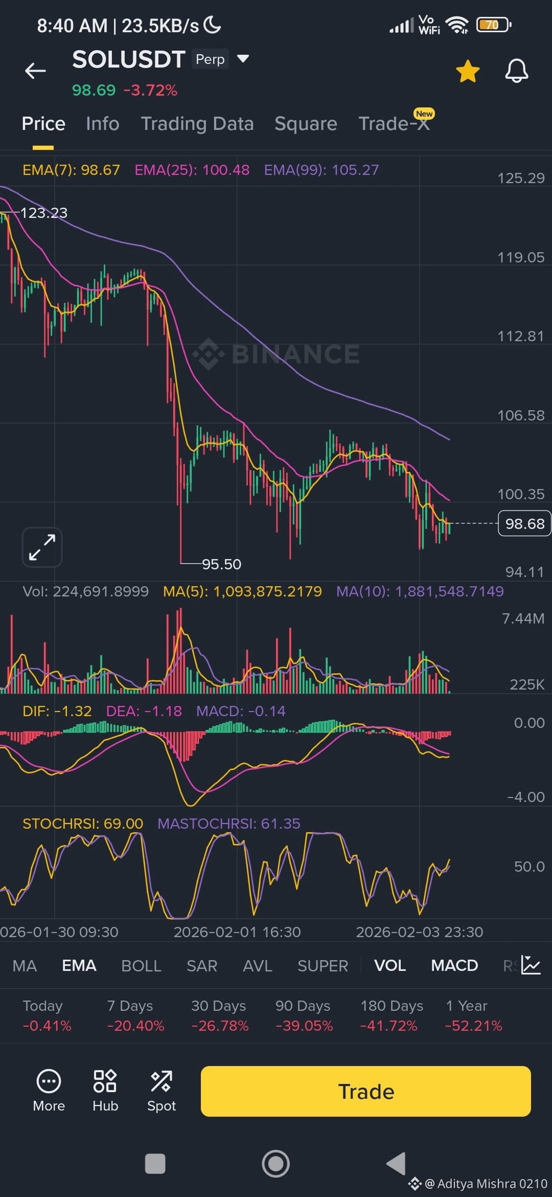 Reasoning: NEUTRAL/SHORT. SOL has broken key psychological support at $110. Unless it reclaims $105 quickly, the momentum suggests a test of the $85–$90 range. Shorting local bounces toward $105 with a tight stop is a viable "risk-off" play.