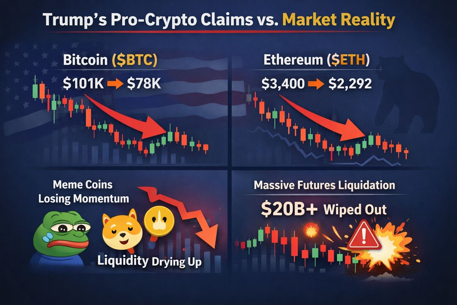 Дональд Трамп говорит, что его политика была более дружелюбной к криптовалютам, чем любое предыдущее руководство 🏛️💬 — но рыночные данные рисуют более смешанную картину 📊.