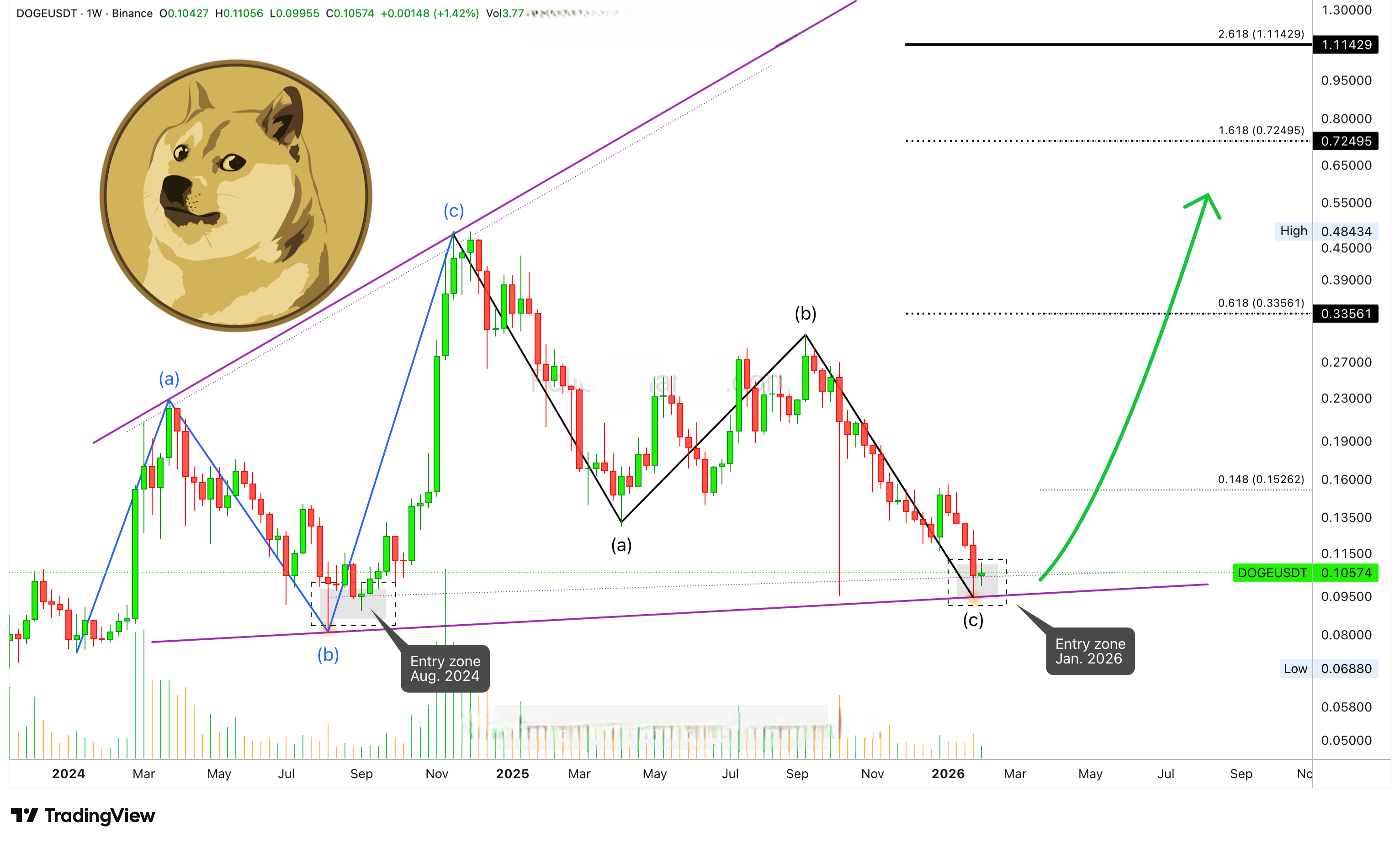Догекоин сейчас торгуется в "хорошей зоне входа". Низкие цены с поддержкой, обозначенной как восходящая линия тренда, а также минимальный уровень, который можно увидеть в октябре 2025 года.