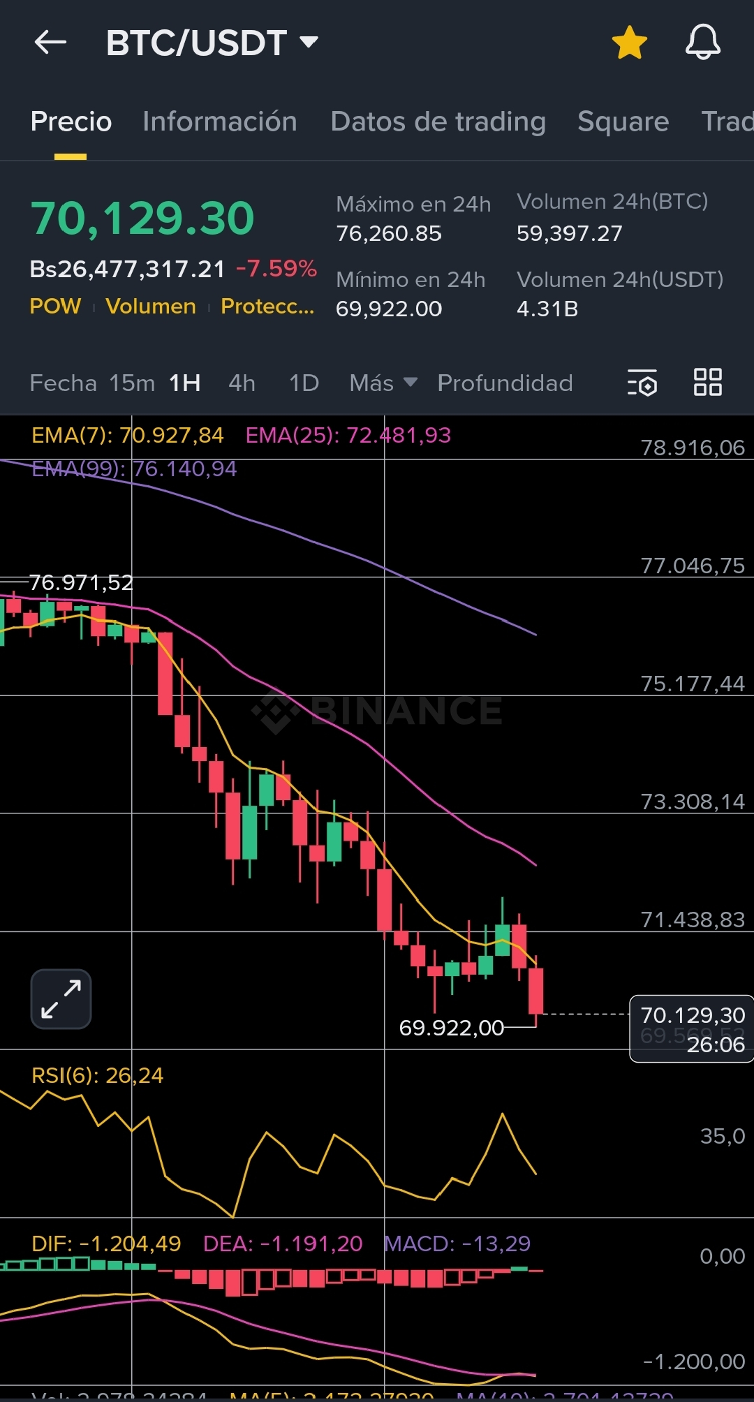 Сила продавца: MACD показывает растущие красные бары, что подтверждает, что медвежий импульс все еще имеет силы. Скользящие средние (EMA 7 и 25) теперь действуют как труднопреодолимые потолки на уровне $70,680 и $71,140 соответственно.
