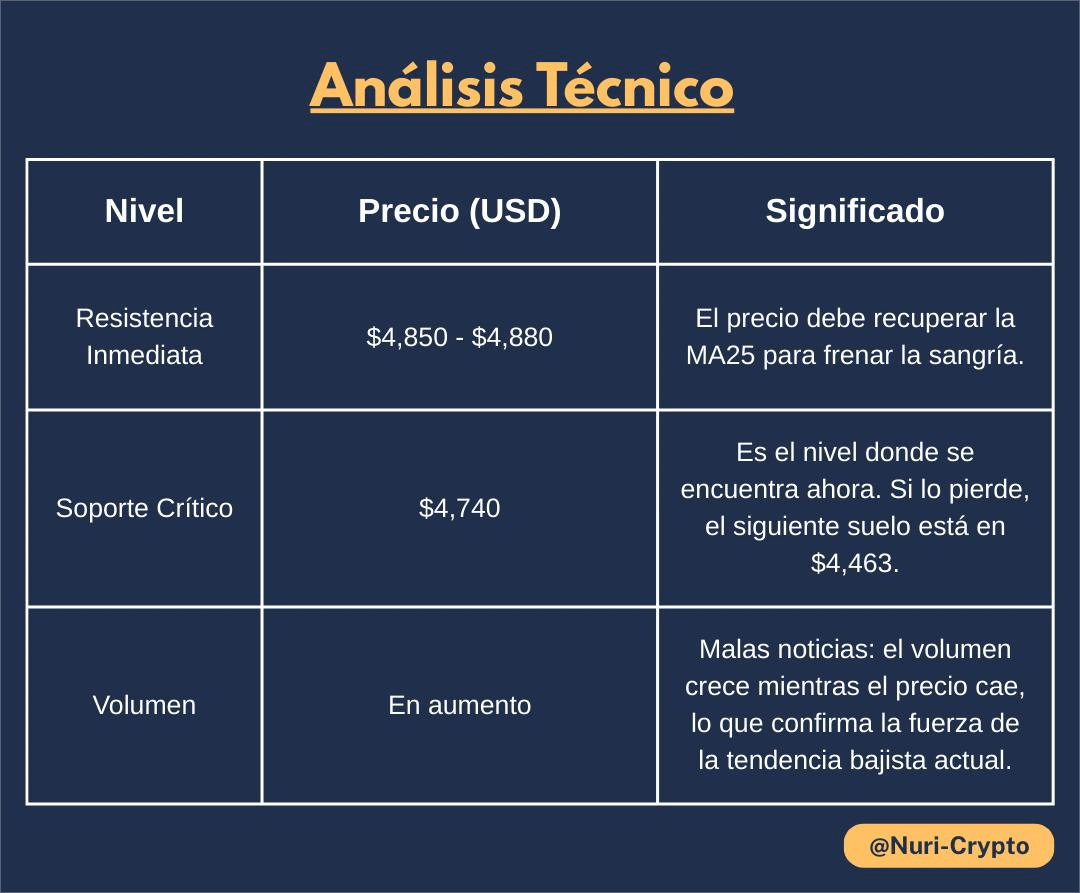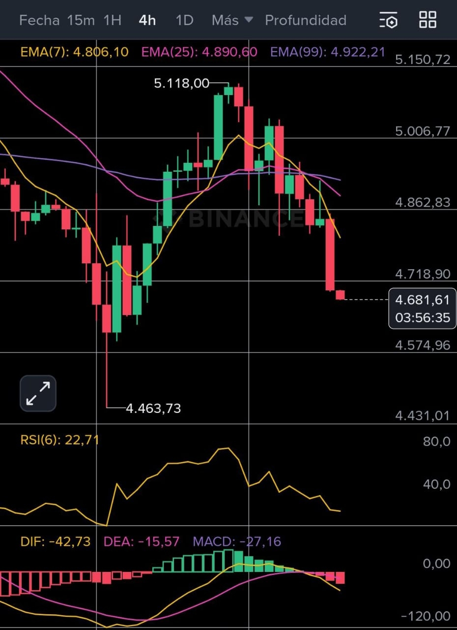 Сигнал изменения? Пока нет ясного сигнала о развороте. RSI (Индекс относительной силы) на графиках, которые вы отправили, показывает, что актив входит в зону перепроданности, что может привести к небольшому "отскоку мертвой кошки" к $4,800, но общая тенденция остается нисходящей.