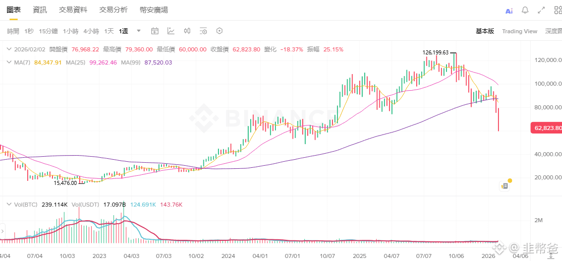 如果你直接拉開 $BTC 週線觀察成交量,你會發現一個有趣的現象: