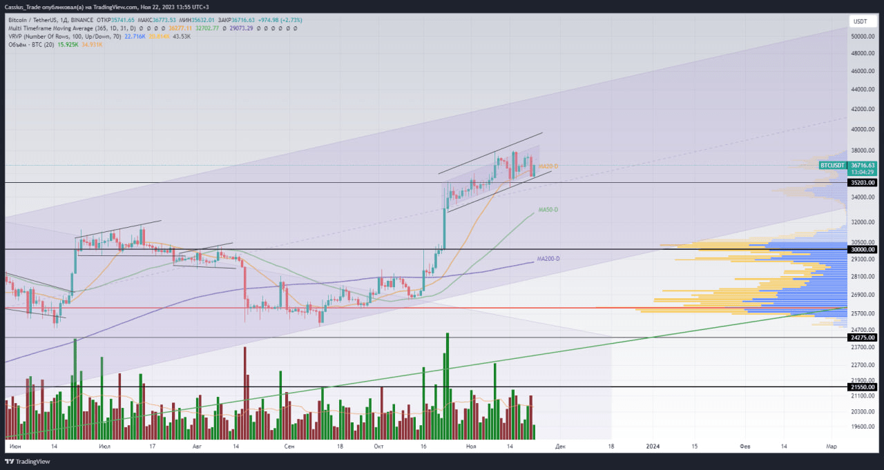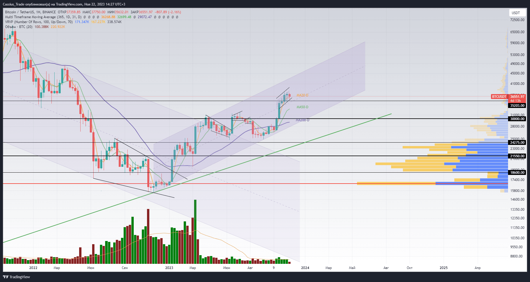 Более того, если посмотреть на локальный тренд, то переживать и закрывать позиции стоит только после пробоя данного канала вниз. На текущий момент это примерно 35250$ за 1 BTC. Поэтому, пока мы внутри локального восходящего канала торопиться с закрытием позиций не стоит.