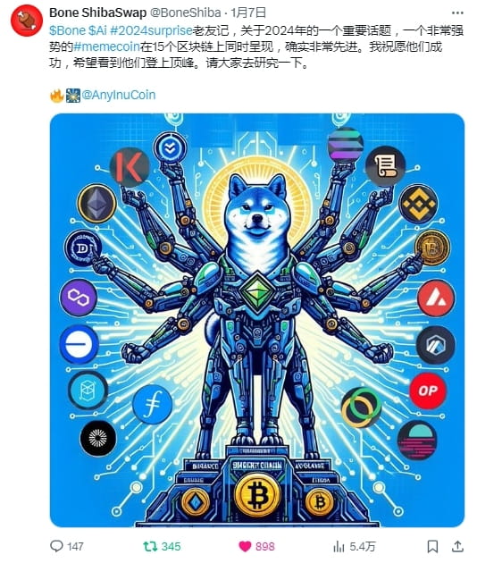 AI (anyinu) вызвал повальное увлечение токенами с несколькими цепочками, как только он появился. Он пользуется большим спросом на первичном рынке. Сообщество беспрецедентно популярно, и к нему присоединяются все больше и больше людей. люди! В настоящее время он находится на первичном рынке и поддерживает покупки кошельков DEX во всех публичных сетях. Он еще не котируется на вторичных биржах, а рыночная стоимость очень низкая! Это первая мультичейновая монета MEME, ее сообщество ориентировано на всю сеть и все цепочки, весь трафик и все средства, а ее масштаб определенно превысит масштаб одной цепочки. В настоящее время он находится на ранней стадии, и внешний мир единогласно полагает, что ИИ обладает потенциалом золотой собаки и, как ожидается, в конечном итоге превзойдет SHIB!