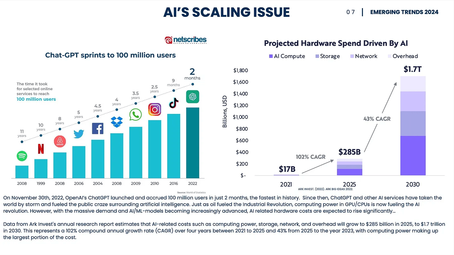 ● Поскольку ценность вычислительных ресурсов растет с каждым днем, Io.net стремится снизить стоимость аренды мощности графического процессора/процессора, что имеет решающее значение для масштабирования искусственного интеллекта и машинного обучения. Спрос на вычислительную мощность растет быстрее, чем предложение, демонстрируя растущий разрыв между спросом и предложением.