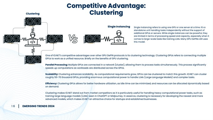 В области Web3 появляются многие рынки компьютерных приложений, включая Akash, Render, Nosana, Clore.ai, Inferx, Aioz, Fluence Labs и GPU.NET и другие. Несмотря на жесткую конкуренцию на рынке, Io.net быстро завоевал внимание отрасли благодаря привлечению 30 миллионов долларов США в рамках финансирования серии А от таких звездных институтов, как Hack VC, Solana Labs и криптовалютной торговой платформы OKX. Его текущая оценка достигла. 1 миллиард долларов. В области DePIN Io.net выделяется своей ведущей технологией кластеризации. Эта инновационная функция позволяет Io.net объединять несколько компьютеров в мощный суперкомпьютер. В настоящее время это единственный сервис, который может создавать децентрализованные кластеры в большом масштабе, что дает ключевое преимущество для разработки сложных решений искусственного интеллекта.