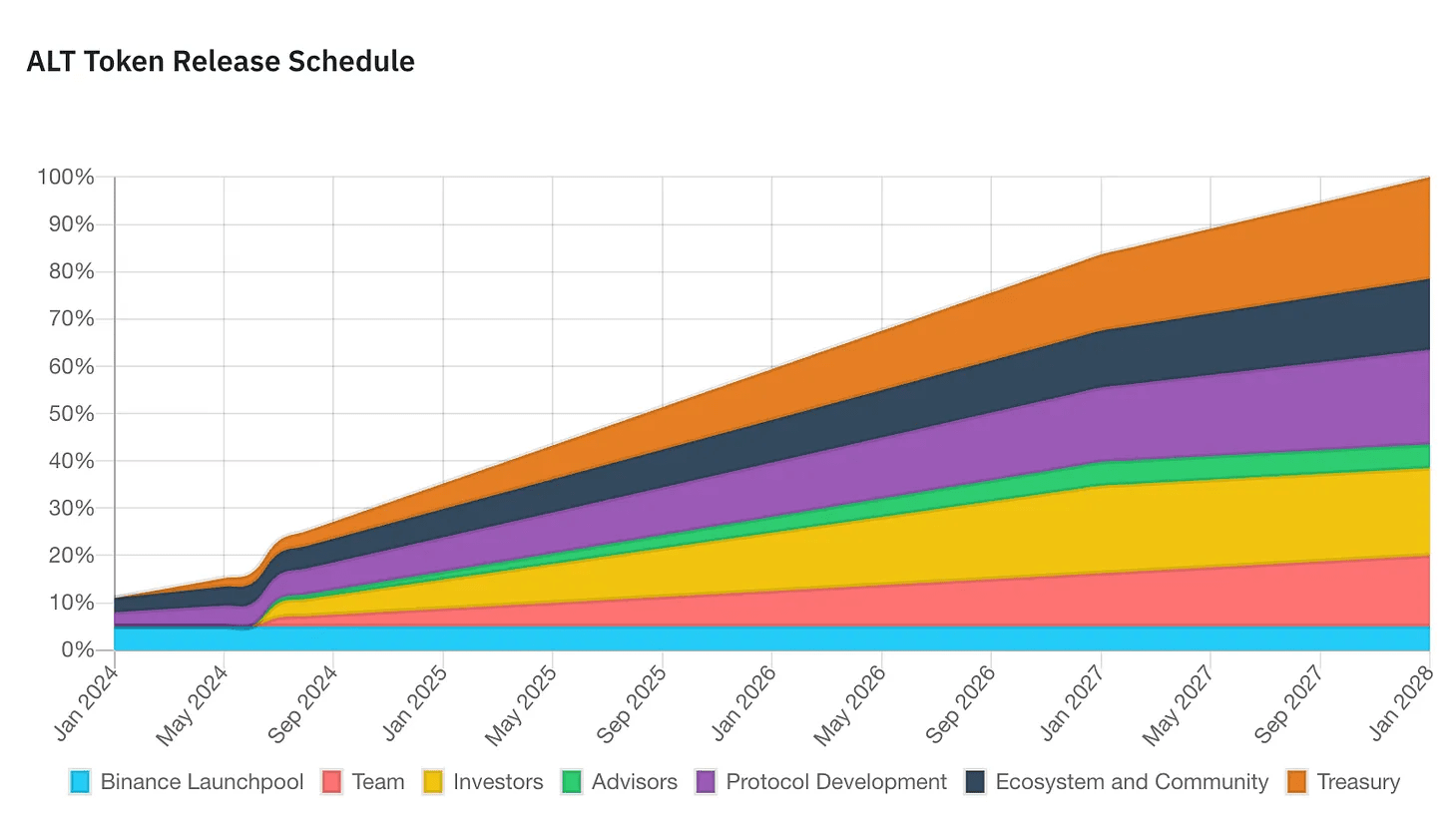 Токен ALT является основной валютой платформы, в настоящее время в обращении находится 1,1 миллиарда токенов, что составляет 11% от общего количества в 10 миллиардов. Он выполняет несколько функций: служит финансовым обеспечением, которое можно смягчить в случае злоупотреблений; позволяет владельцам голосовать за решения, влияющие на протокол; вознаграждает участников в экосистеме платформы и используется для оплаты услуг внутри сети;