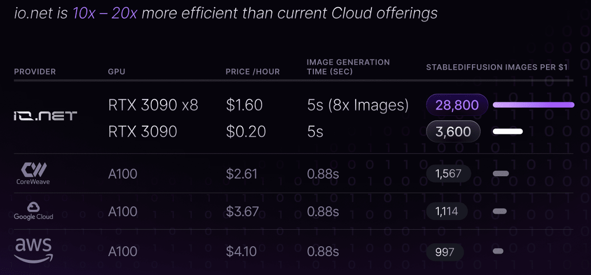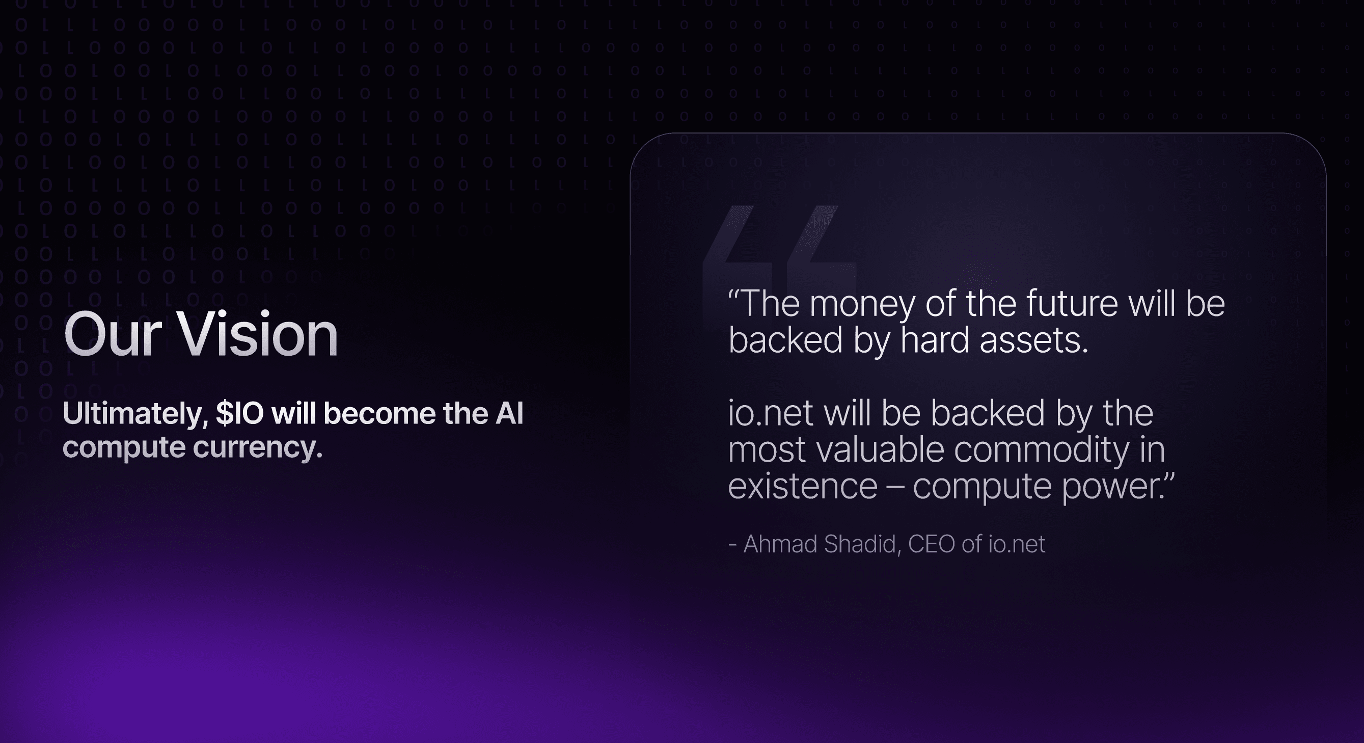 Уникальной является его децентрализованная операционная модель, которая объединяет графические процессоры из независимых центров обработки данных, криптомайнеров и других криптопроектов, таких как Filecoin и Render, для формирования крупномасштабной вычислительной сети в сочетании с децентрализованной сетью физической инфраструктуры (DePIN). выделенный токен $IO для поддержки сетевых операций.