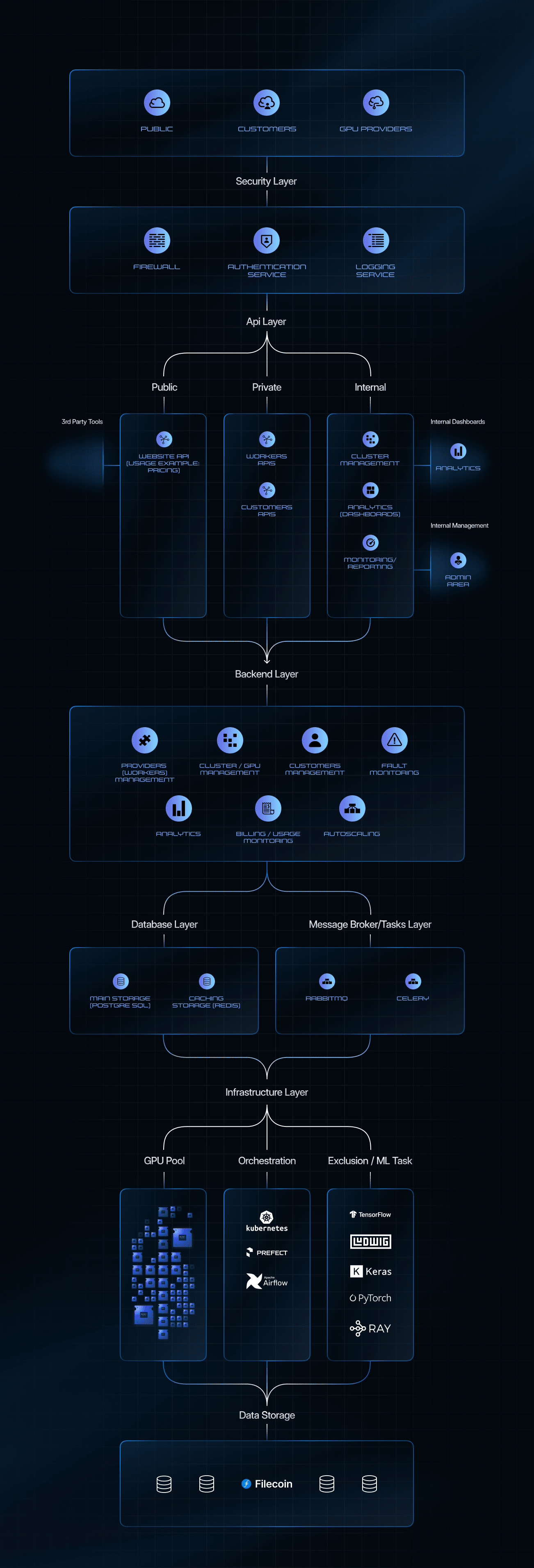 Архитектура включает в себя уровень пользовательского интерфейса, уровень безопасности, уровень API, серверный уровень, уровень базы данных и уровень задач, а также уровень инфраструктуры, которые обеспечивают поддержку управления кластером, взаимодействия с клиентами и задач машинного обучения. Эта архитектура разработана с учетом высокой степени масштабируемости, гибкости и эффективности, обеспечивая при этом безопасность и стабильную работу системы.