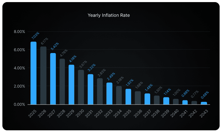 Уровень инфляции $IO рассчитан на снижение из года в год: начальный уровень инфляции составляет 8% и ежемесячная понижательная корректировка составляет 1,02%, что составляет примерно 12% в год. При использовании этой модели дефляции рост предложения токенов будет постепенно замедляться, чтобы контролировать инфляцию.