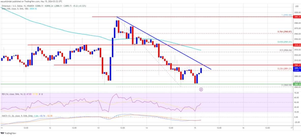 📉 Появляется очевидная линия медвежьего тренда, создающая препятствие вблизи отметки в 2905 долларов на часовом графике ETH/USD (данные получены через Kraken).