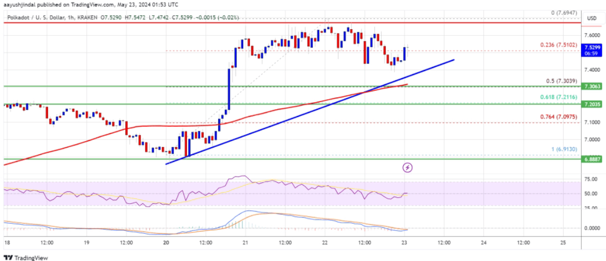 После формирования базы выше $6,80 DOT начал приличный рост. Он преодолел множество препятствий в районе 7,20 доллара и поднялся выше 7,65 доллара, сформировав максимум на уровне 7,69 доллара. Цена сейчас консолидирует рост, подобно Ethereum и Bitcoin.