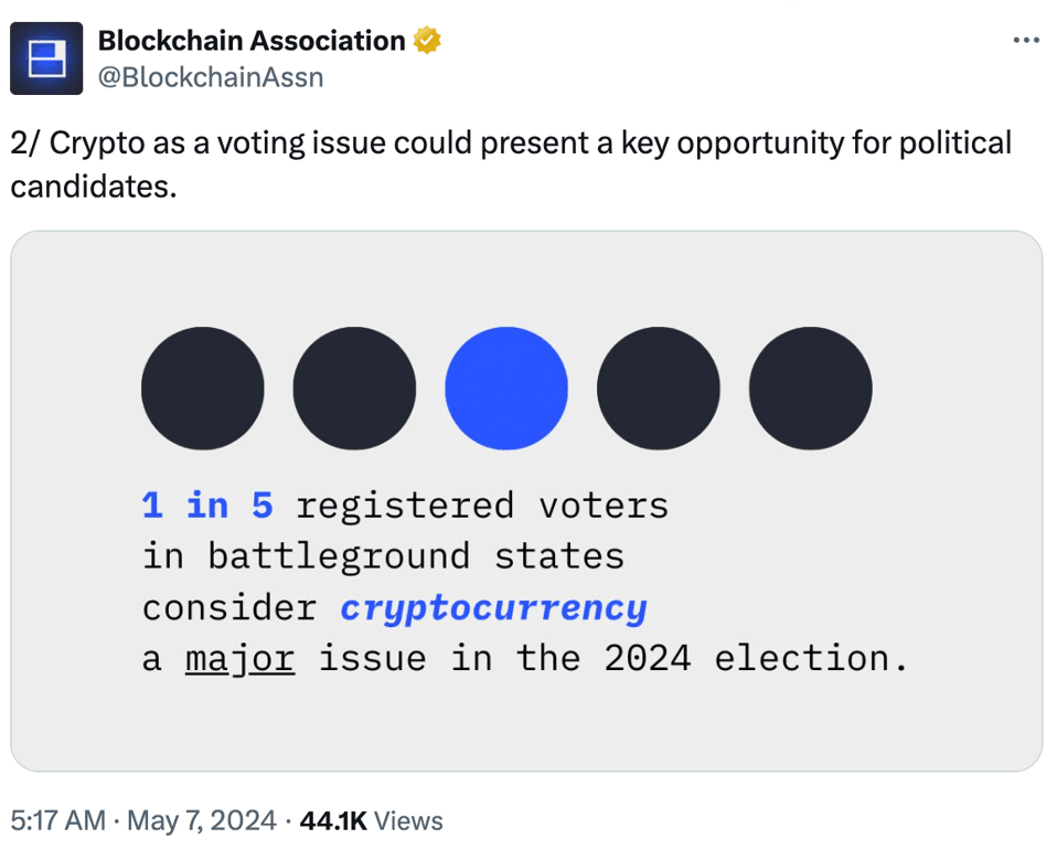 Ранее в этом месяце опрос Национального совета по криптовалютам в США показал, что голосование за криптовалюту может стать ключевым вопросом при принятии решения о предстоящих выборах. Около 8 из 10 респондентов заявили, что позиция кандидата по вопросам криптовалюты как минимум «важна» для их голосования, в то время как 83% подавляющего большинства избирателей, поддерживающих криптовалюту, заявили, что предпочитают кандидата, который «хочет написать четкие правила для криптовалют, чтобы что у инвесторов по-прежнему будет выбор, а отрасль сможет продолжать расти и создавать рабочие места».