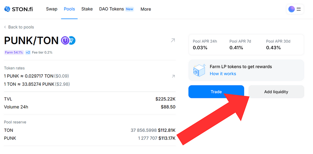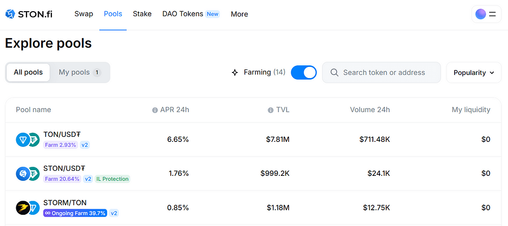 To find all farming pools on STON.fi go to the Pools section and turn on the Farming filter.