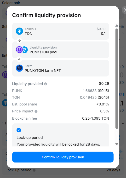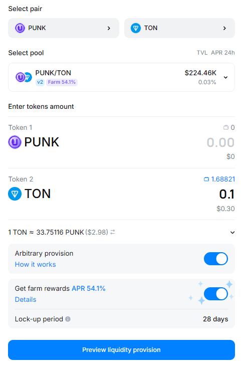 Analyze the data described above especially Price impact which in this case is 0.3% this means that 0.3% will be lost during the automatic exchange of TON to PUNK (Arbitrary provision).