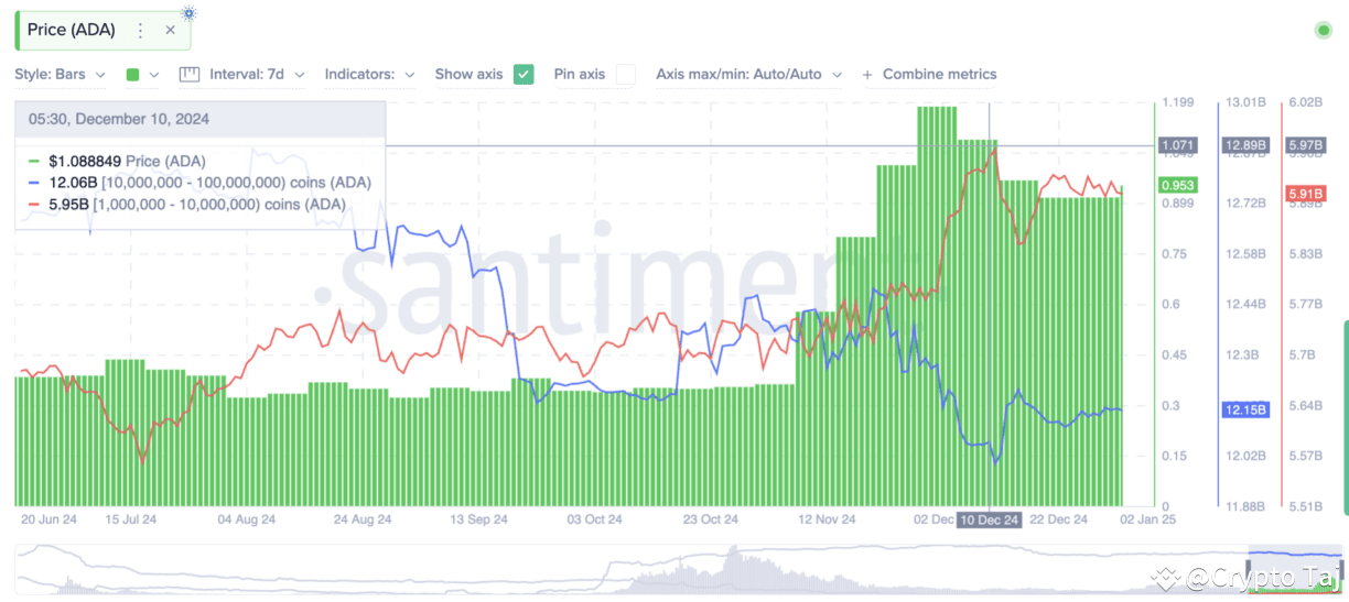 Cardano (ADA) saw a 10% price increase in 24 hours, signaling a potential bullish trend for 2025. This rebound follows late 2024 gains as the broader crypto market stabilizes. However, achieving the $1 mark may encounter obstacles, with a decline in whale activity raising concerns. Bitcoin's rise above $97,000 has improved market sentiment, aiding the recovery. The future momentum of Cardano depends on increased investor confidence and reduced selling pressure from large holders.