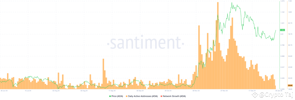 Network growth metrics, which spiked alongside the rally, have now slowed significantly. This suggests waning momentum and reduced confidence among ADA holders. The decline in daily active addresses signals that participation has weakened despite the asset’s relatively moderate pullback in price.