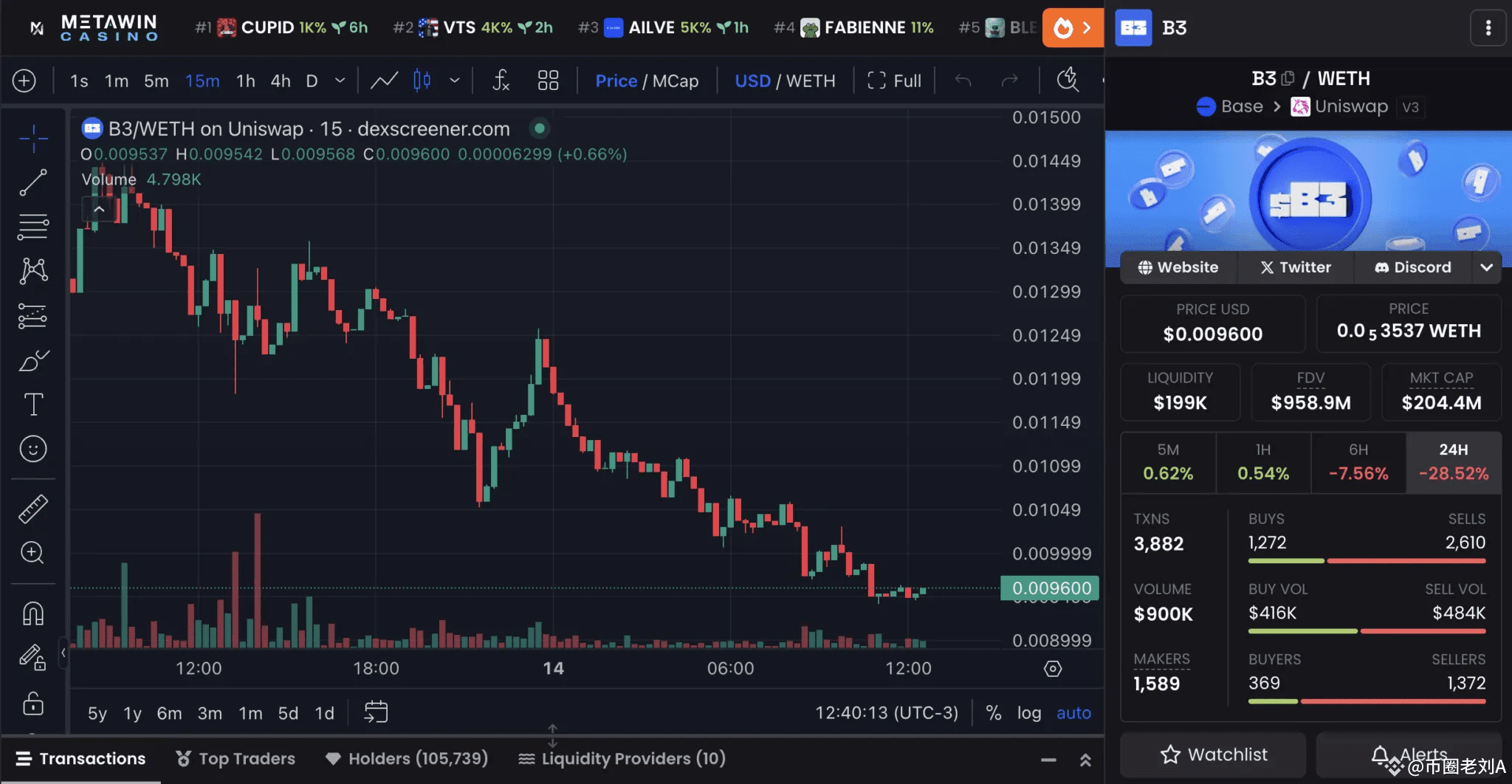 B3 在上线近五天后,迅速跃升为 Base 上第八大代币。尽管过去 24 小时内价格下跌了 30%,该项目仍持续吸引投资者,拥有超过 10.5 万名持有者,市值超过 2.03 亿美元。