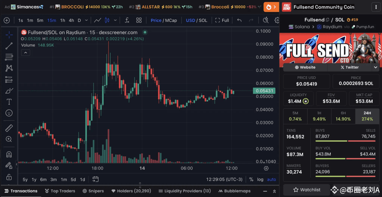 FULLSEND 四天前在 Pumpfun 上上线后迅速走红,市值飙升至 5400 万美元。仅在过去 24 小时内,交易量就超过 16.4 万笔,并吸引了超过 2 万名持有者,成为 Solana 链上最活跃的新加密货币之一。
