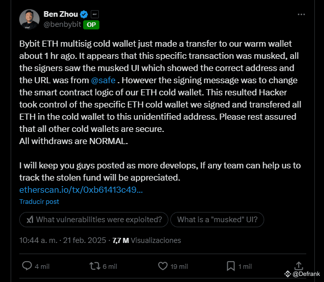 Más tarde el CEo del exchange centralizado, Ben Zhou ,indicaba en un anuncio oficial que una de las billeteras frías de #ETH del Exchange se encontraba realizando transacciones rutinarias, y en uno de esos movimientos los hackers lograron obtener acceso a la interfaz de usuario de la plataforma (a través de un ataque phishing previo), lo que les permitió sustituir el contrato de implementación de monedero multifirma por una versión maliciosa. Es así que los atacantes obtuvieron permisos necesarios para empezar a procesar transferencias de fondos no autorizadas.