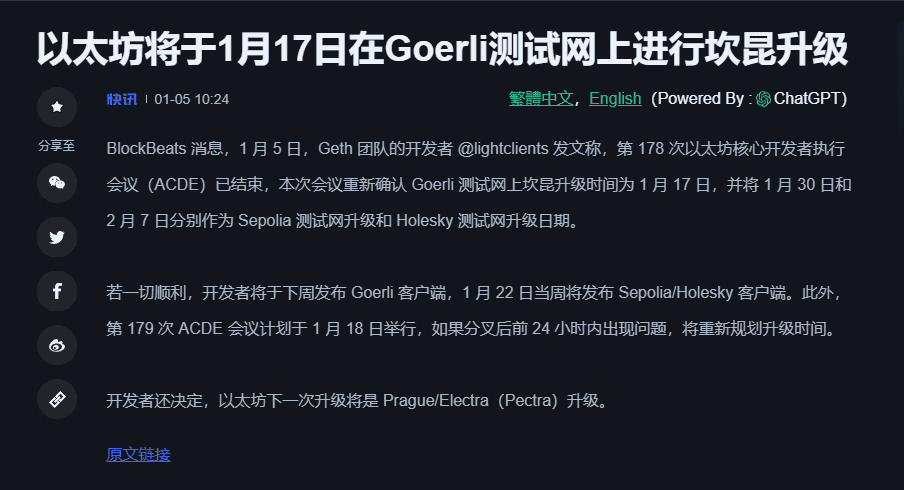 以太坊将于一月十七日Goerli测试网上进行坎昆升级,大家都拿好自己的利好币种了么!