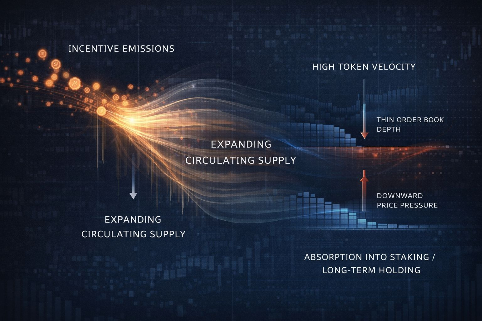 On the other hand, if a portion of tokens is held, staked, or reintegrated into the ecosystem, velocity decreases. In that case, effective selling pressure may be lower than nominal supply growth, giving the market time to form a more balanced structure.