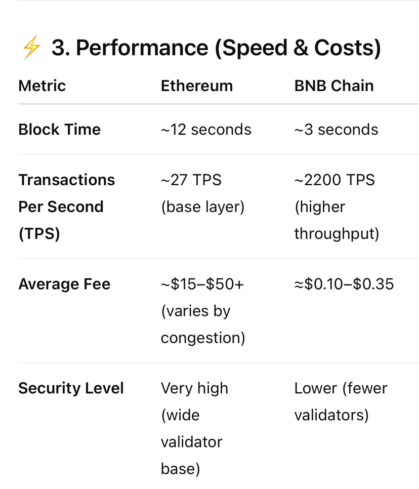 ➡️ BNB Chain has much faster block times and far lower fees, making it attractive for high-volume applications and microtransactions.