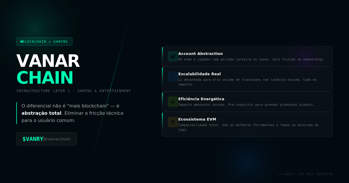 Escalabilidade Real: Uma arquitetura de Camada 1 (L1) desenhada para altíssimo volume de transações com latência mínima. Para entretenimento, cada milissegundo de atraso destrói a imersão.
