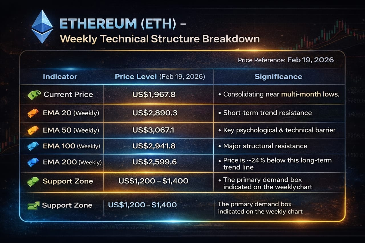 Ethereum (ETH): Ethereum remains in a "capitulation" phase. The US$1,800 - $1,900 demand zone is being heavily tested. A recovery depends on reclaiming the US$2,000 level and, eventually, the US$2,600 EMA resistance. Investors should monitor Layer 2 adoption and the progress of the Fusaka upgrade as primary indicators of long-term value.