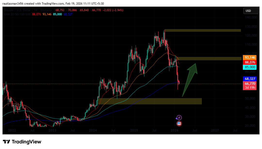 The weekly chart (Image 2) highlights a critical support zone (the lower yellow box) between US$40,000 and US$50,000. This area represents a historic consolidation point where significant buying interest has previously resided. Conversely, an arrow on the chart points toward a potential relief target of US$90,000 - $93,000, aligning with the 50-day EMA.
