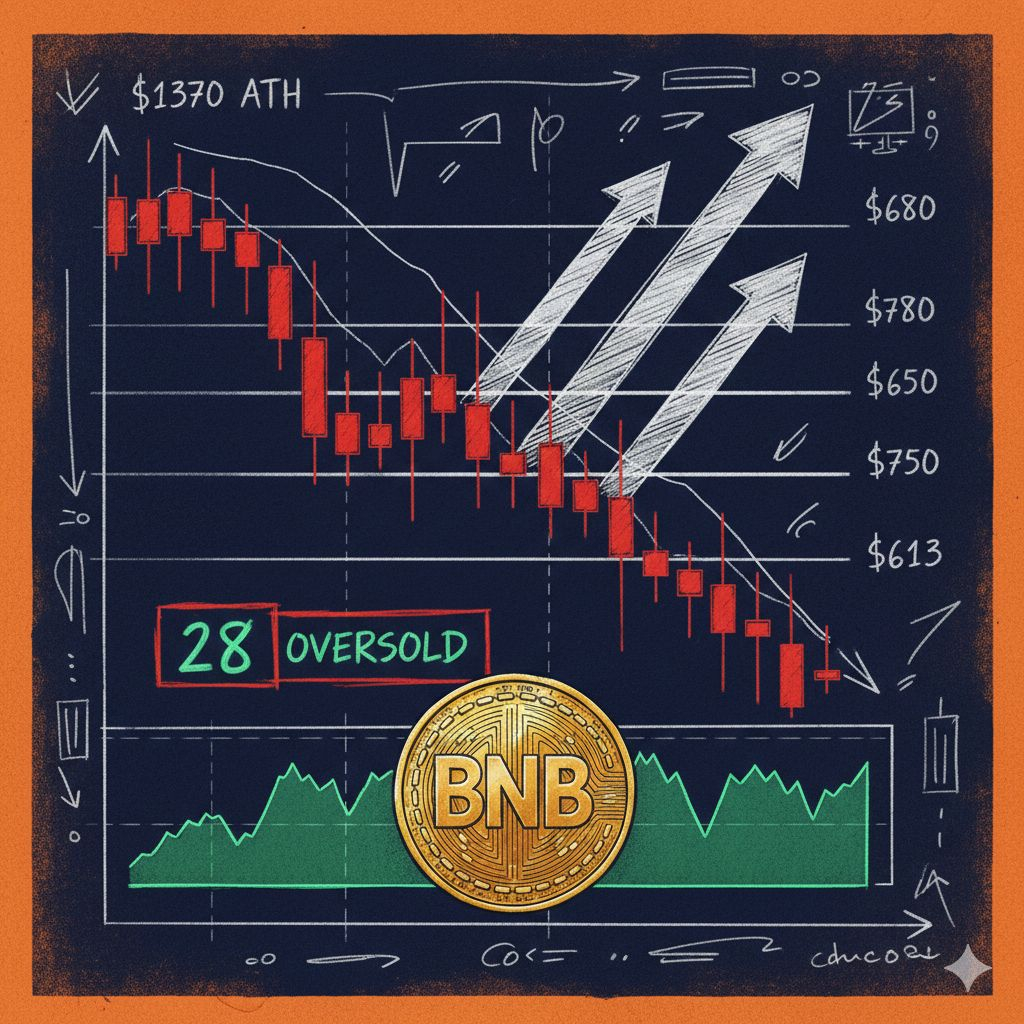 BNB's 14-period RSI sits at 28 â deep in oversold territory below 30. Historically, this zone has been a reliable bounce signal. The MACD histogram has flattened, suggesting selling pressure may be exhausting itself.