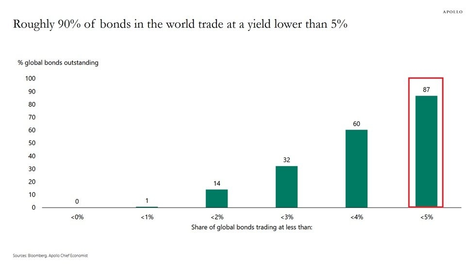 87% Below 5%: A massive 87% of all bonds worldwide currently trade at a yield below 5%.