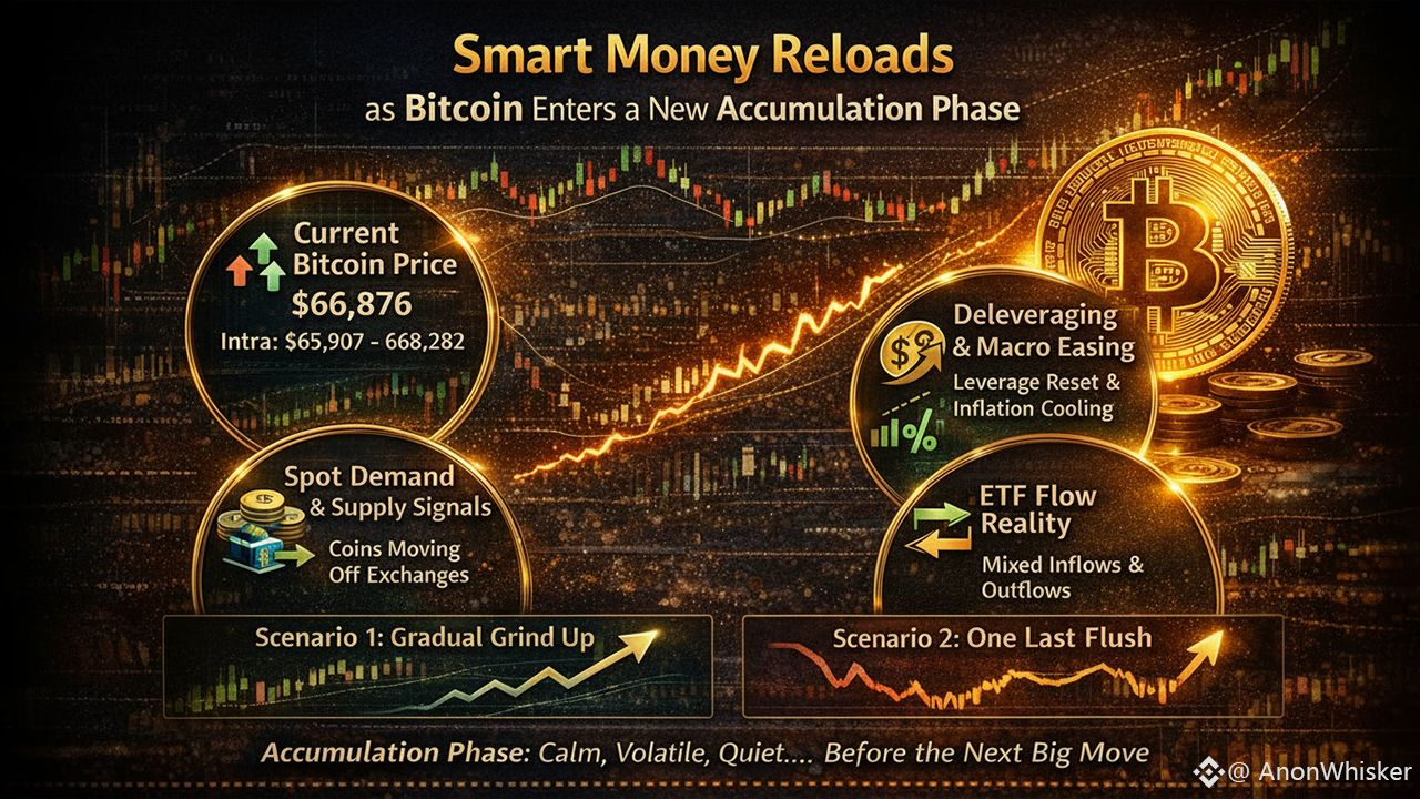 As of today, Bitcoin is trading around $66,876 (intraday range roughly $65,907–$68,282). That level matters less as a “number” and more as a signal: the market is no longer trending cleanly, it’s digesting and digestion phases are where accumulation often hides.