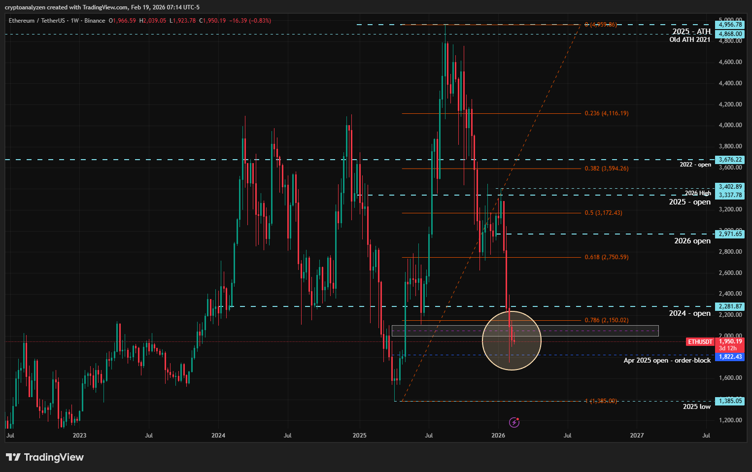Currently (week 3 of 2026), the price has dropped below the 78% Fibonacci retracement level and below the gap zone, briefly entering the April 2025 order block zone — the month in which a reversal formation developed, followed by a strong upward move and the formation of a new ATH.