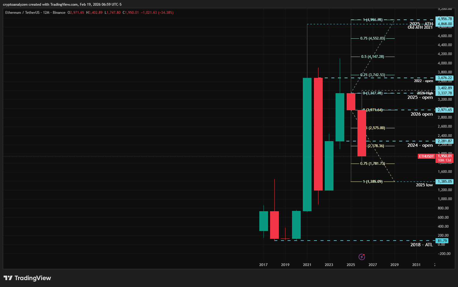 Considering the sharp decline from the 2026 opening level (2,971.64) at the start of the year, there is a high probability of an upward rebound — potentially testing not only the 2026 opening level but also previous yearly opening levels, as well as the Fibonacci levels derived from the upper wick of the 2025 annual candle.