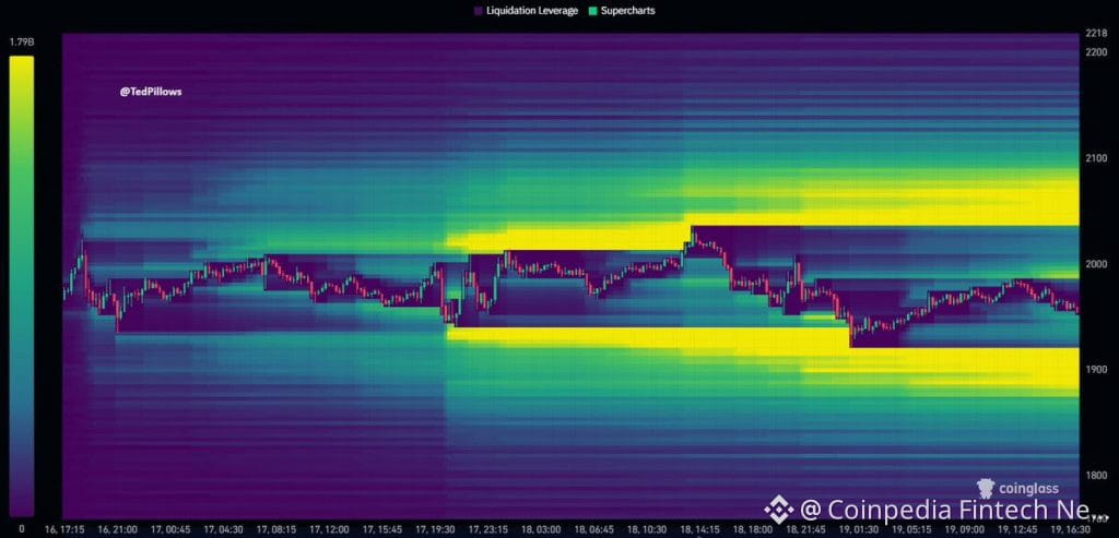 On the flip side, strong liquidity is stacked below the price near $1,900–$1,880, where long positions are heavily exposed. A breakdown into this zone could trigger cascading sell-offs, dragging ETH toward $1,850 or lower. Until one side is cleared, the price is likely to chop between these two liquidation pockets.