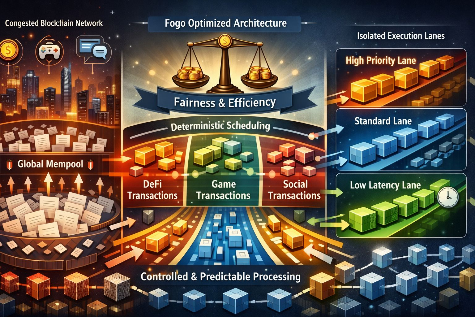 One of the most consequential refinements involves how Fogo handles transaction ordering and execution scheduling. Rather than relying solely on priority fees in a global mempool race, Fogo implements structured scheduling layers that group transactions by resource domain and execution dependencies. This enables the network to process non-conflicting transactions in parallel while ensuring deterministic outcomes. Under congestion, this model prevents the chain from devolving into a gas-price arms race that disproportionately favors bots and capital-intensive actors. Instead, execution lanes remain available for smaller transactions and time-sensitive interactions, preserving usability during peak demand periods.