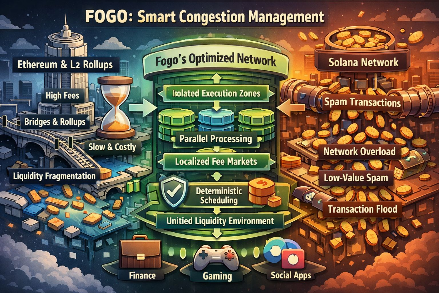 The race to build high-performance blockchain infrastructure has shifted from raw throughput claims to a more nuanced problem maintaining predictable performance under real-world congestion. As decentralized finance, gaming, social protocols, and on-chain trading generate bursty demand patterns, systems that once performed well in benchmark conditions can degrade quickly when confronted with sudden transaction spikes. Fogo has emerged within this landscape as an architecture designed not merely to scale but to sustain determinism, fairness, and efficiency during congestion events. Rather than optimizing exclusively for maximum transactions per second, Fogo is optimizing for controlled execution flow, economic prioritization fairness, and state consistency when network demand exceeds capacity.