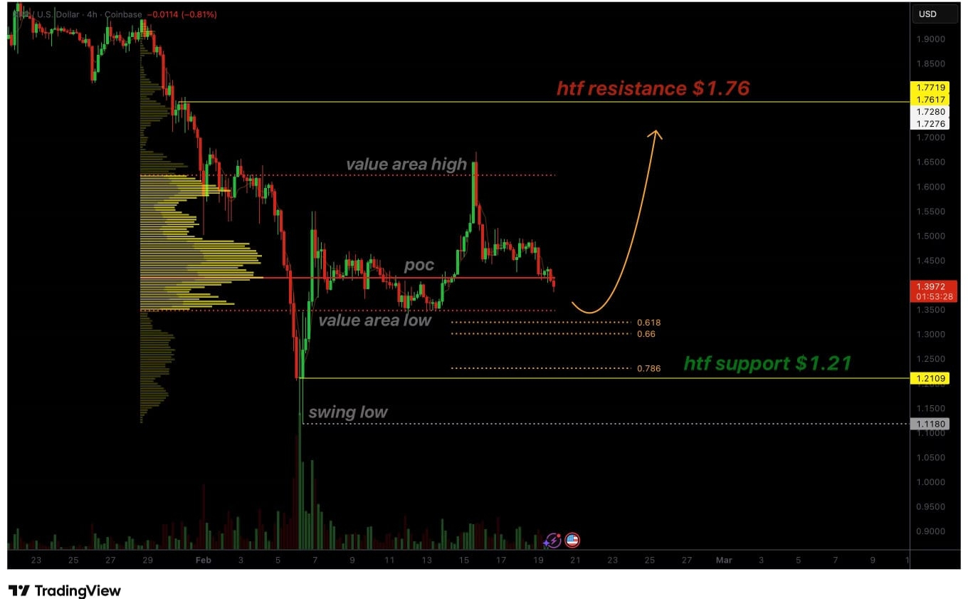 If the higher low successfully forms, attention shifts toward high-timeframe resistance near $1.76. This level represents the next major technical objective and aligns with prior rejection zones within the broader trading range.