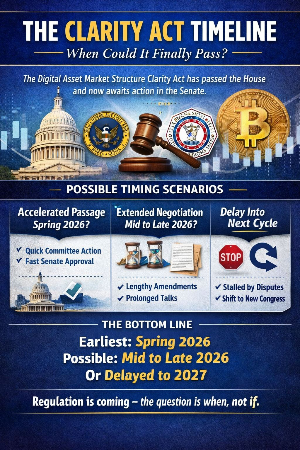 The earliest plausible window for passage is spring 2026. The more probable timeline stretches into mid or late 2026. While the bill has momentum following House approval, Senate procedure and negotiation complexity mean that speed is not guaranteed.