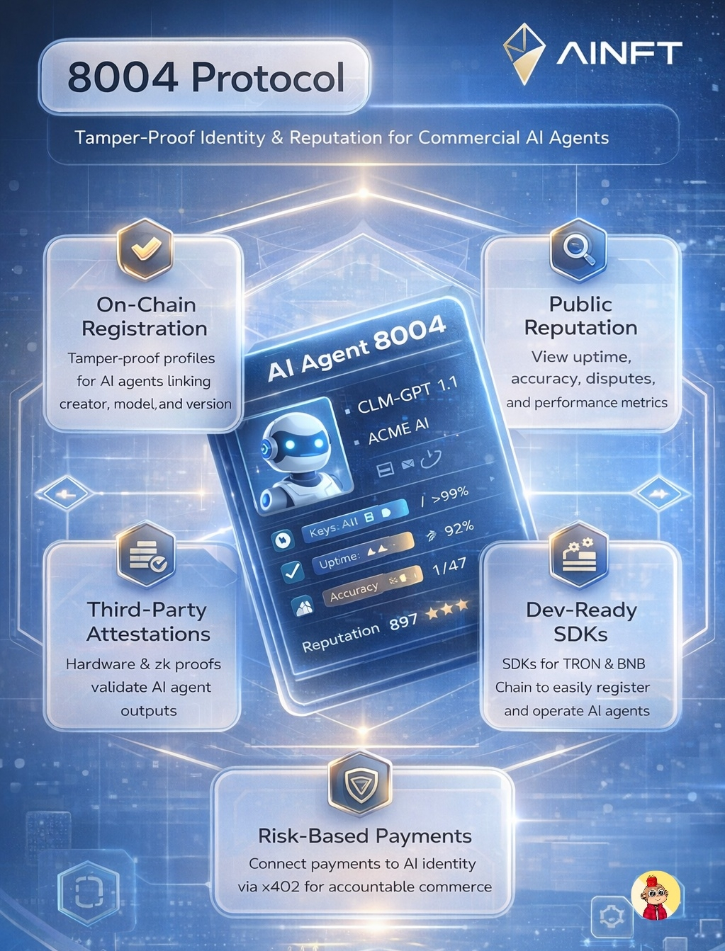 8004 bridges that gap by attaching certified identity + reputation to every agent-sourced output. When paired with x402 payments on @OfficialAINFT, youโre no longer accepting just a payment, youโre accepting a claim backed by verifiable on-chain proof.