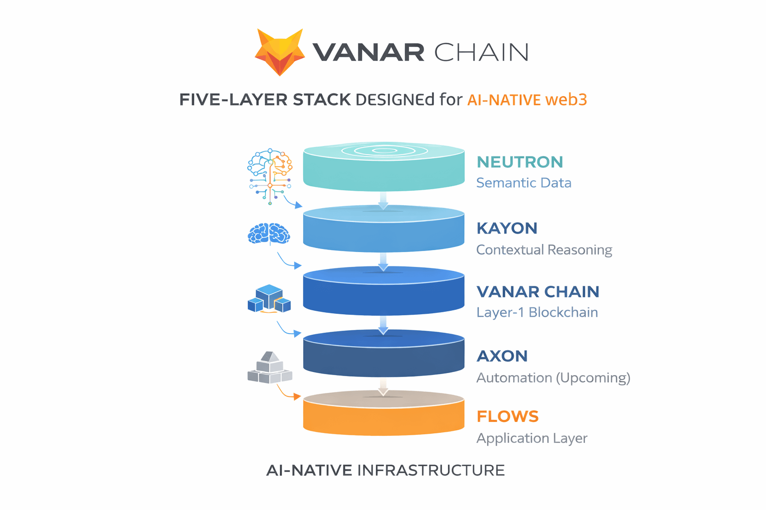 At a time when most public chains compete on throughput, fees, or EVM compatibility, Vanar’s architectural thesis is fundamentally different: embed AI semantics and reasoning into the blockchain stack itself. Its five-layer stack — consisting of the foundational modular Vanar Chain layer, semantic data persistence (Neutron), on-chain contextual reasoning (Kayon), and forthcoming automation and application layers (Axon and Flows) — reframes what “Web3 application logic” can mean.
