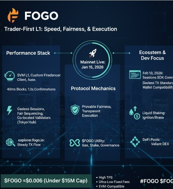 Concrete dev push: February 13, 2026, Fogo Sessions SDK got a fresh commit in the repo—updates to gasless tx standards and wallet compatibility. No proposal ID/block specifics public, but it's tied to core infra for seamless session-based trading (sponsored fees, no per-tx drag). This tweaks protocol parameters toward broader dApp adoption, visible in ongoing Flames incentives and pool activity on explorer.fogo.io. Builds momentum post-ignition lock closeout, keeping early liquidity committed without big unlocks looming.