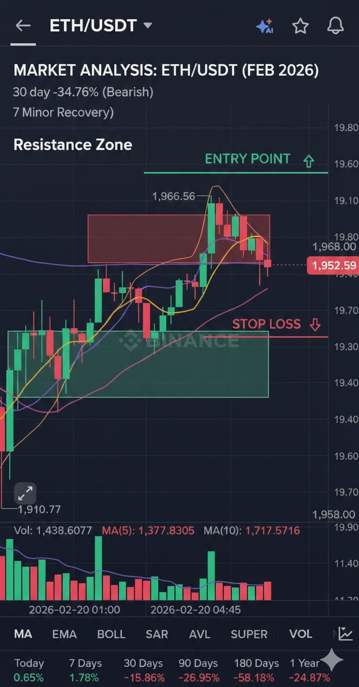 The chart shows the MA(7), MA(25), and MA(99) converging closely around the $1,950 level. This "cluster" often signals a period of indecision or consolidation. The price is currently fighting to stay above the MA(99) ($1,952.96), which is acting as immediate resistance.