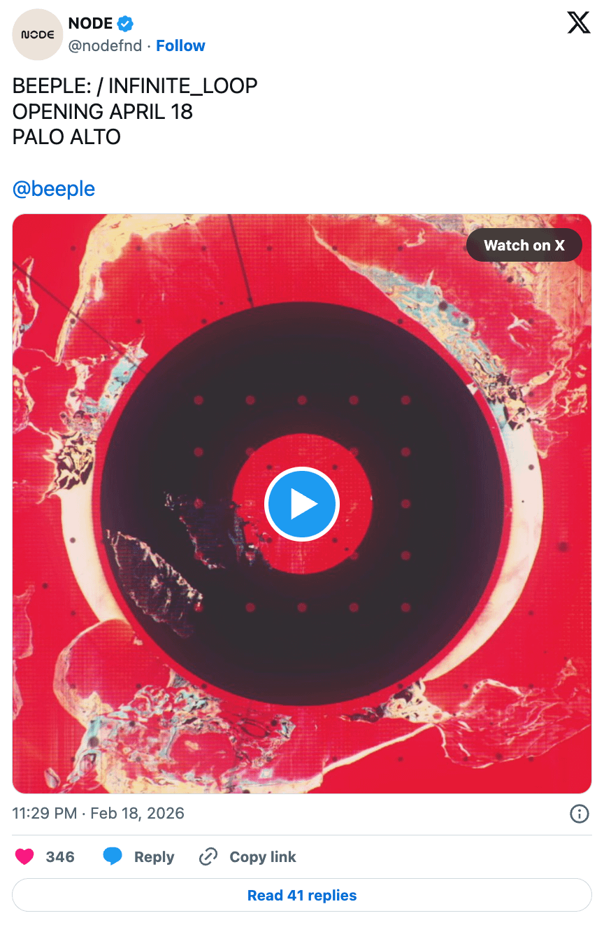 在帕洛阿尔托展览空间 NODE 举办的 INFINITE_LOOP 展览,被誉为 Beeple 的中期回顾展,将全面展出其最具影响力的作品,把被动的观看体验转变为组织者所称的观众与技术之间的沉浸式对话,展览还将邀请社区成员在主装置旁展出自己的艺术作品,模糊观众与创作者之间的界限。