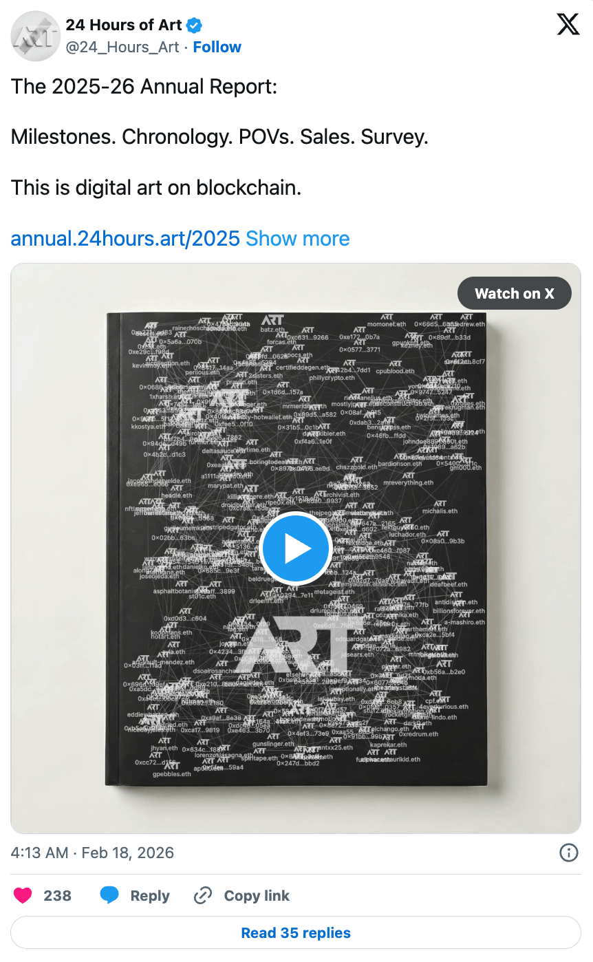 由 Roger Dickerman 创立的每日新闻项目 “24 Hours of Art” 报道了基于区块链的艺术,并发布了其 2025-26 年度报告,该调查涵盖了基于区块链的数字艺术的里程碑、时间表、观点和销售情况。