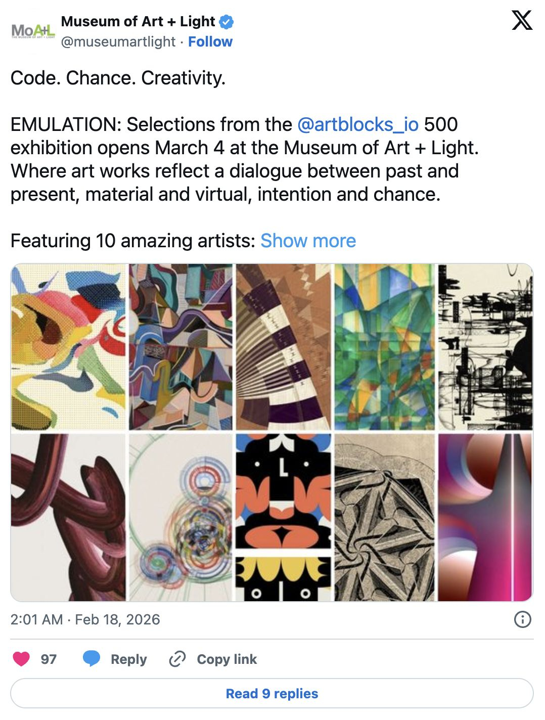 名为“模拟:Art Blocks 500 精选展”的新展览将于 3 月 4 日在堪萨斯州艺术与光博物馆开幕,该博物馆专注于数字艺术和区块链记录的作品。