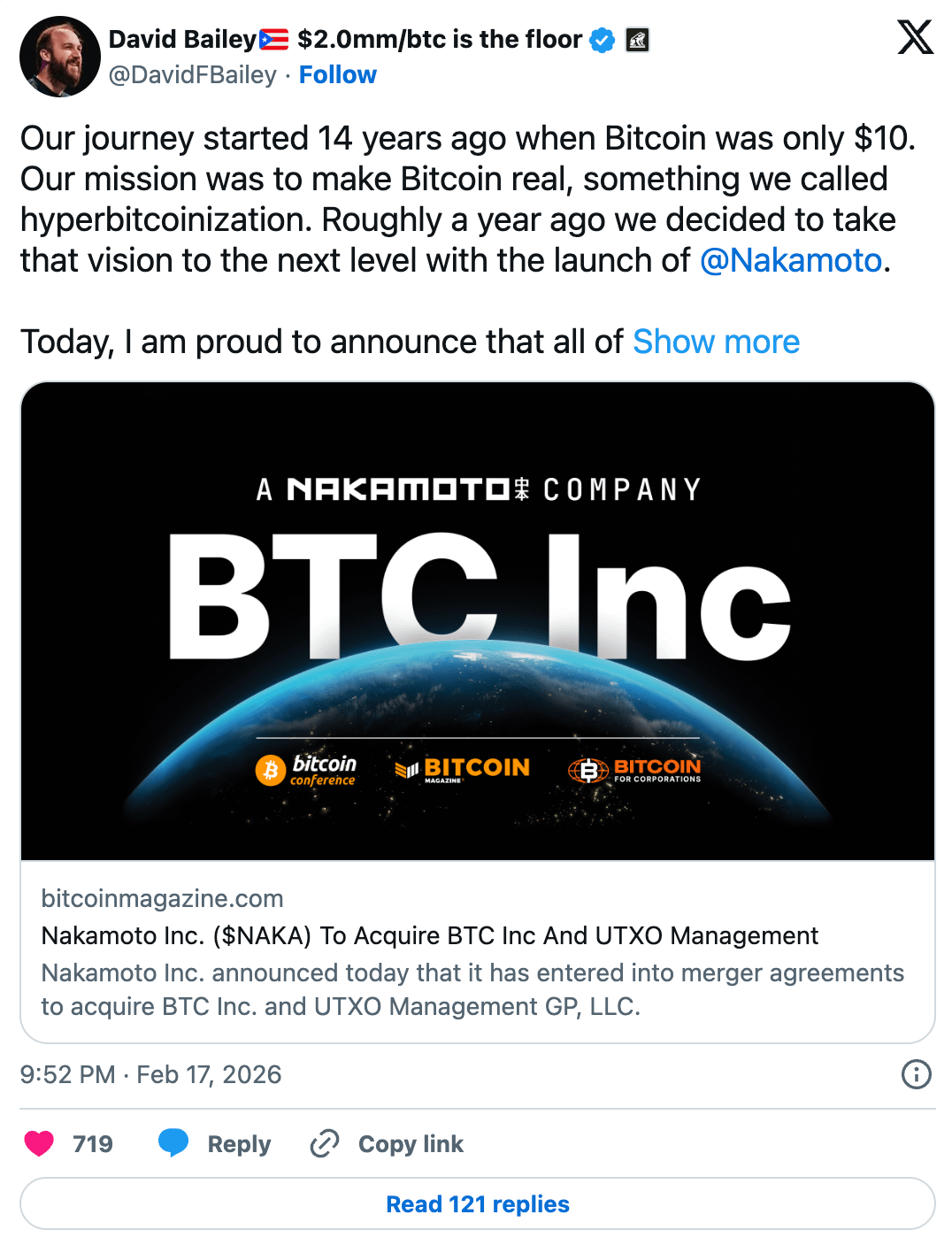 由企业家大卫·贝利领导的公开交易的比特币金库公司 Nakamoto Inc. 同意以全股票交易的方式收购比特币媒体公司 BTC Inc. 和比特币投资公司 UTXO Management,交易价值超过 1.07 亿美元。