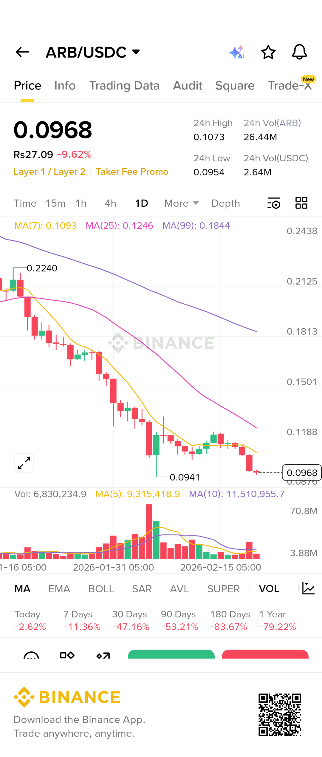 âThe Arbitrum (ARB) chart is currently telling a story of intense pressure. As of today, $ARB is trading at 0.0968, down nearly 10% in 24 hours. For many, this looks like a "red sea," but for a disciplined trader, itâs a moment of critical decision-making.